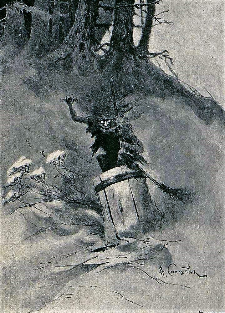 Baba Yaga herself travels in a giant mortar, steering with a pestle and sweeping away her tracks with a broom. It is such a strange detail that it almost feels playful, but it reinforces her connection to domestic tools twisted into something uncanny. Even everyday objects become magical in her hands.
