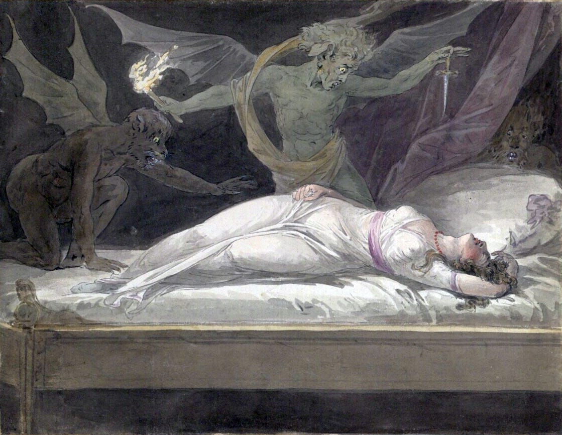 People of the time often described waking in the night unable to move. Their bodies were frozen, their breathing heavy, and a crushing weight seemed to press down on their chest. In the darkness they sometimes sensed a figure perched beside them or leaning over their bed. To them there was only one explanation. A demon had come calling.